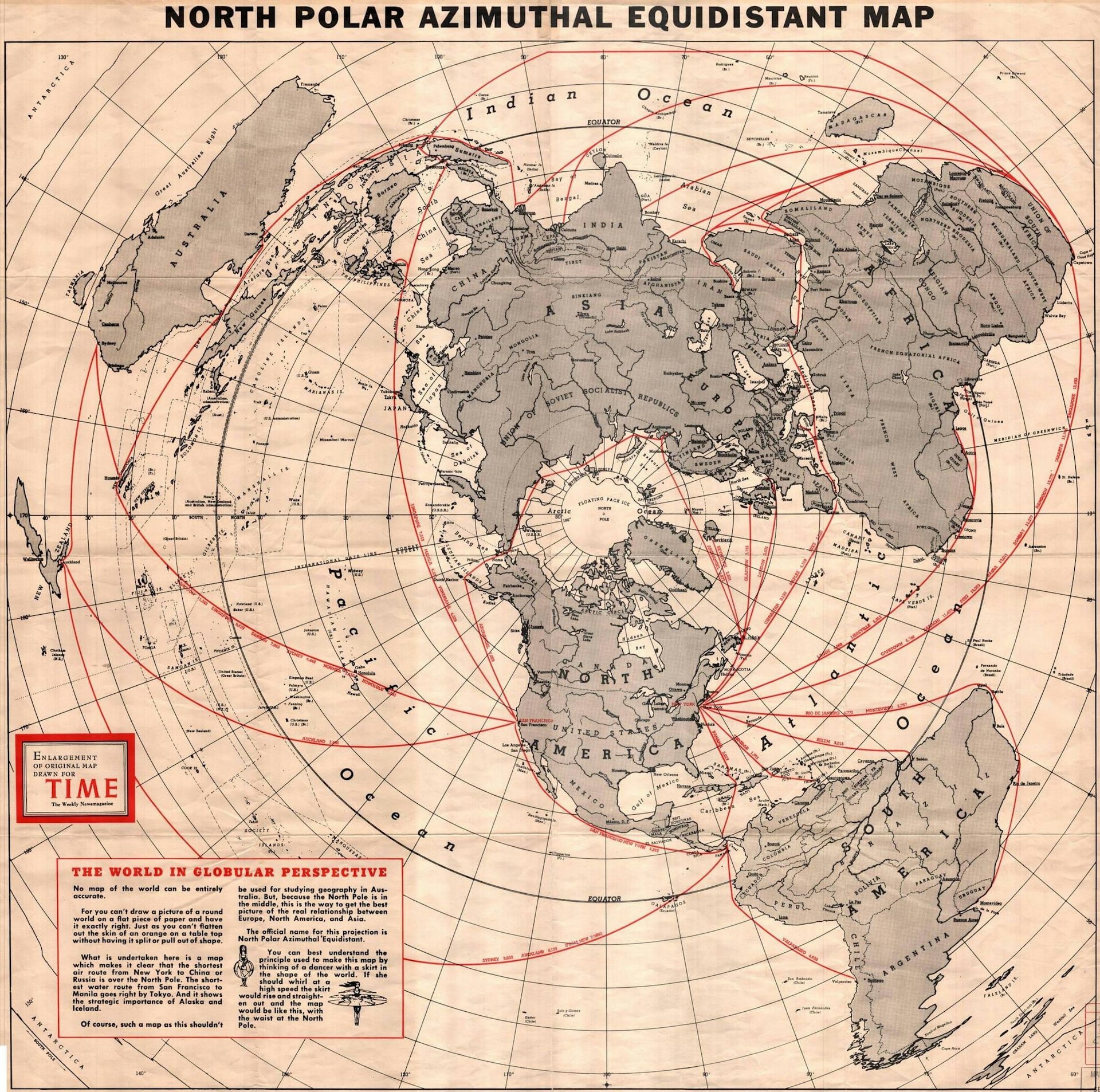 Published in 1950, this map introduces the Azimuthal Equidistant Projection to Time Magazine’s readers. Time Magazine