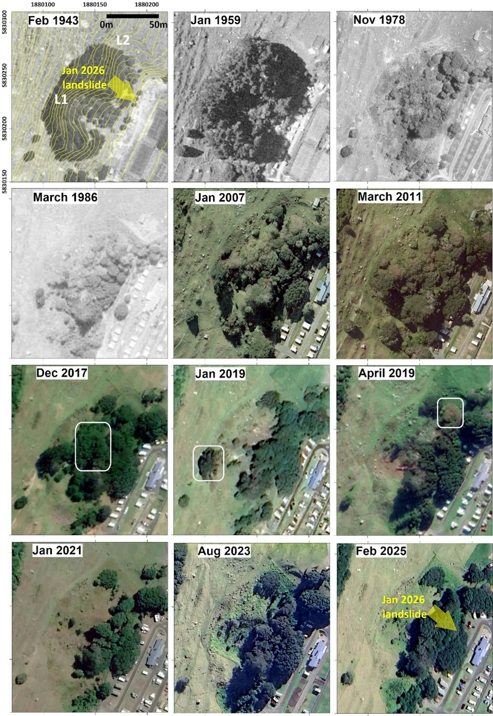 A series of aerial images from 1943 to 2025 show changes in vegetation and landform on the slopes above the campground. White boxes mark key areas, and arrows show the approximate location of the January 2026 landslide. Author provided.CC BY-NC-ND