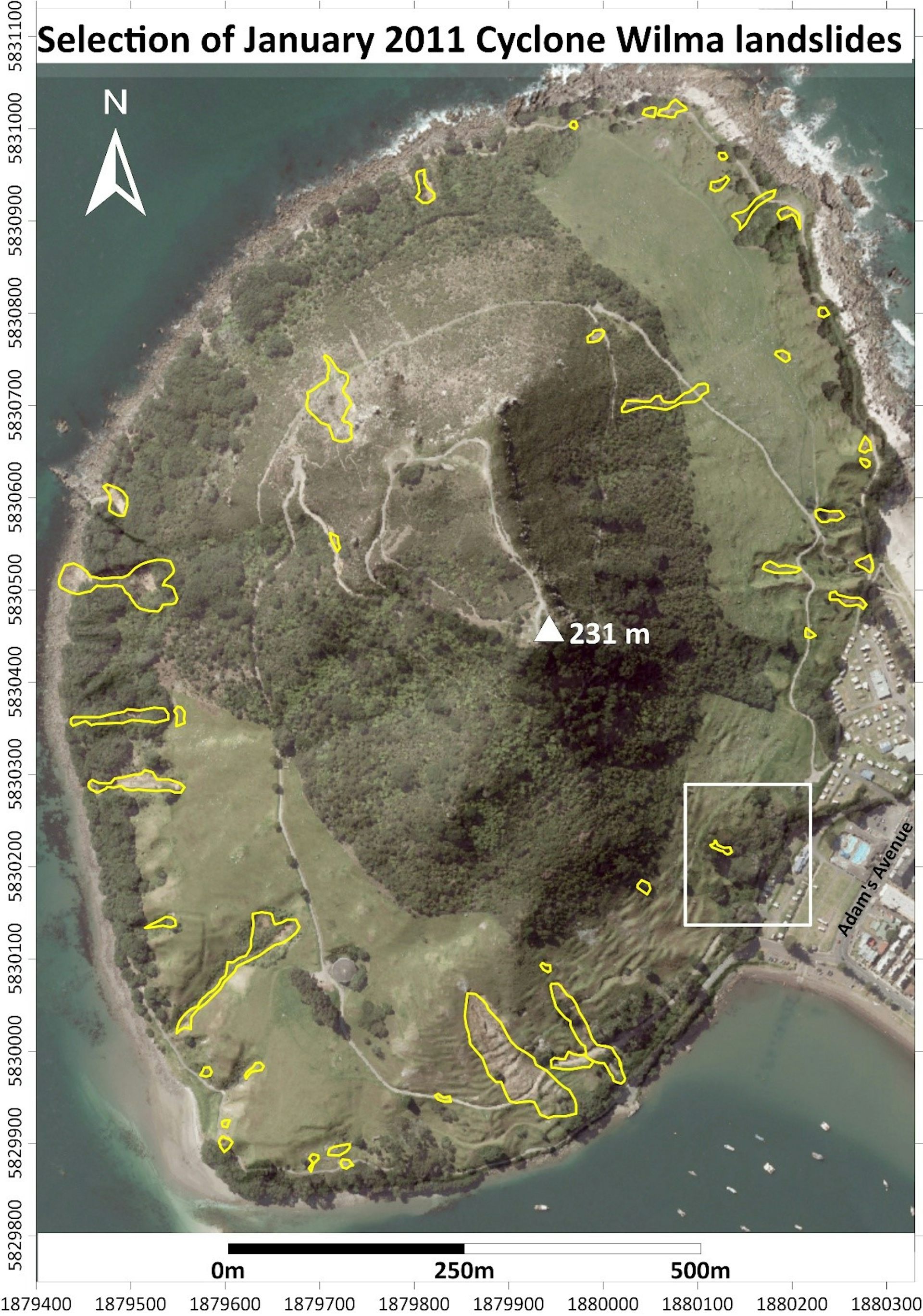 A March 2011 aerial image of Mauao (Mount Maunganui), with some of the larger landslides triggered by heavy rain during Cyclone Wilma in January 2011 outlined in yellow. The white box marks the area in which last week’s landslide occurred. Author provided.CC BY-NC-ND