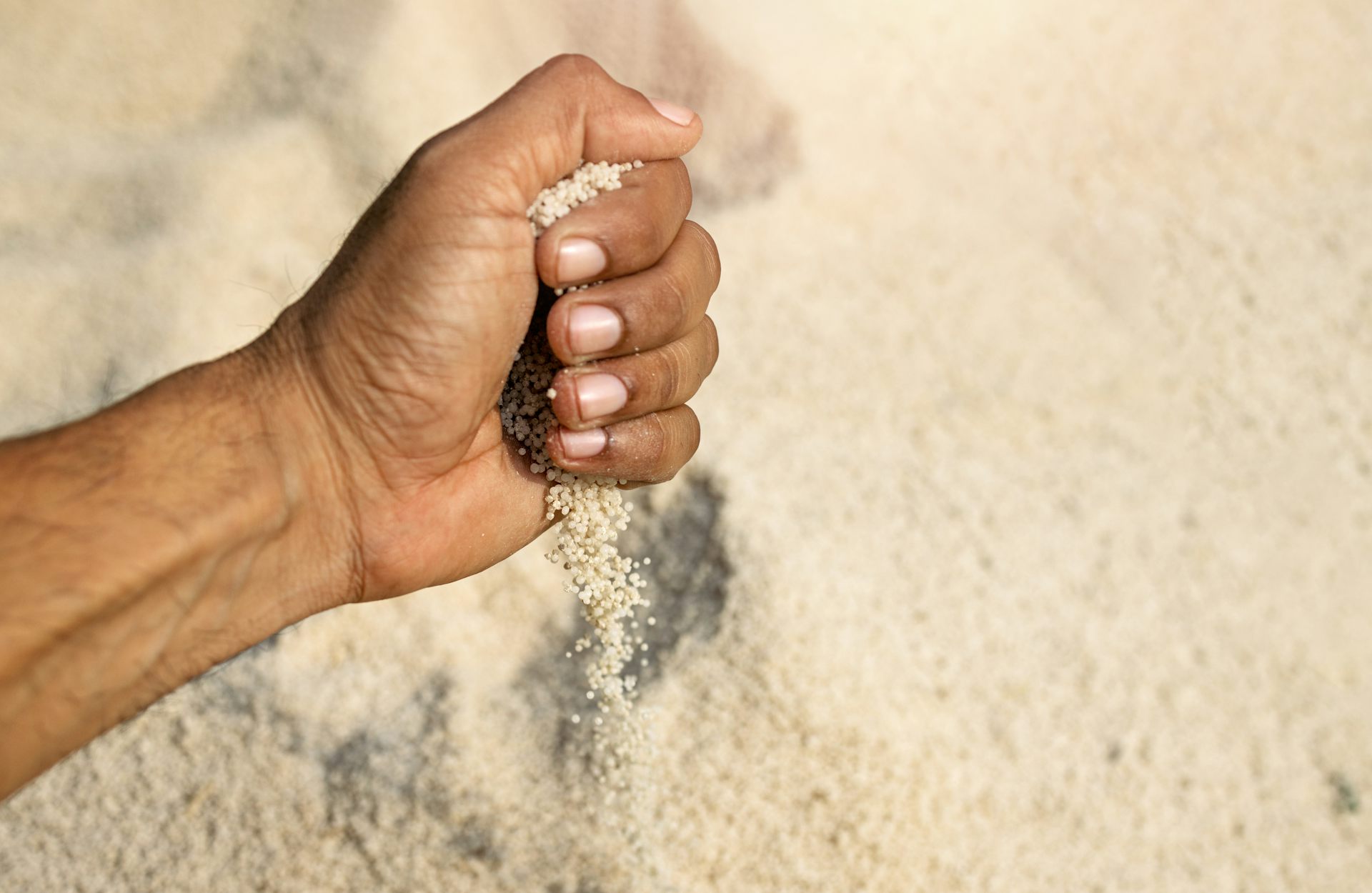 Close-up of a person's hand holding granular urea fertiliser.