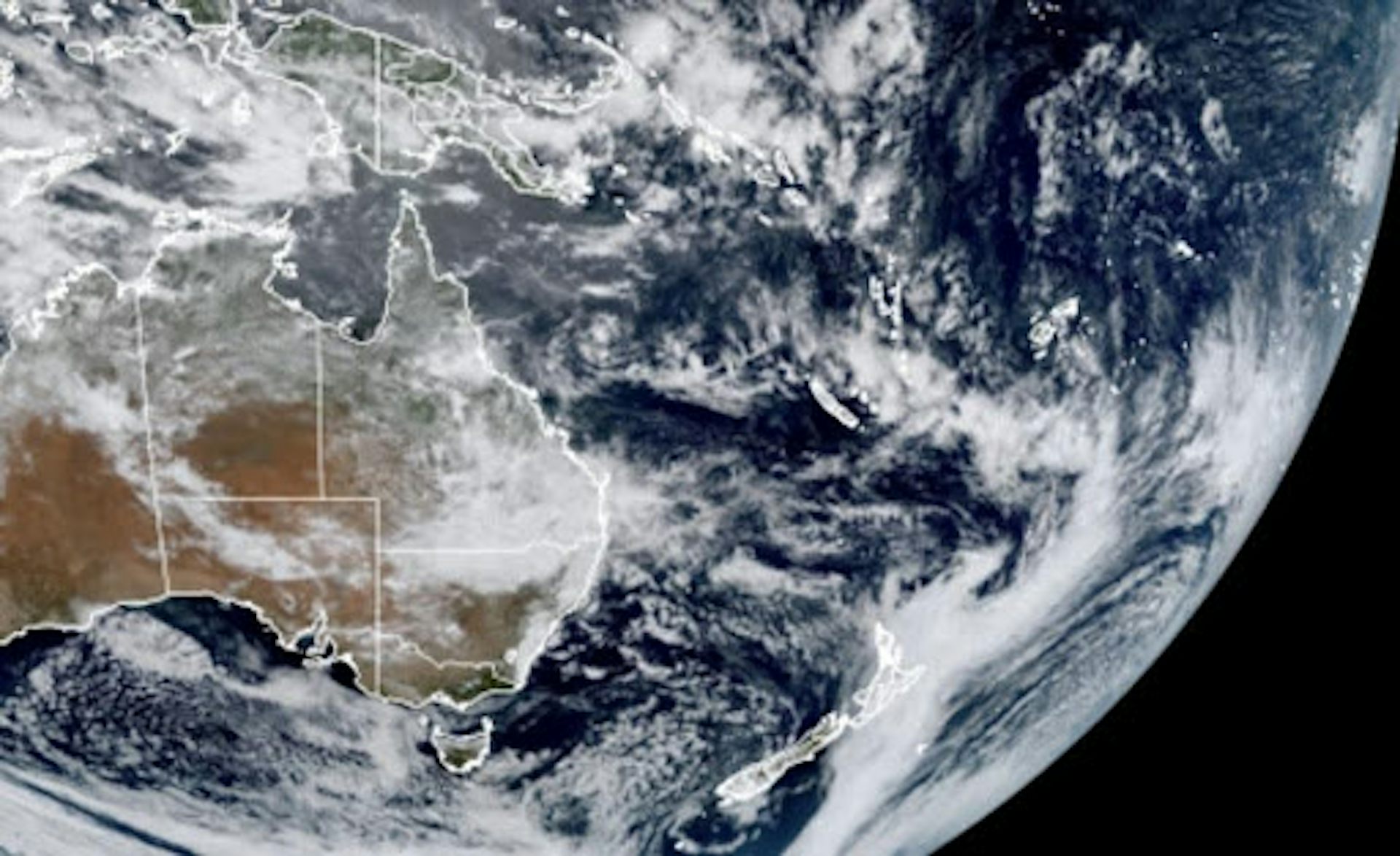 A moisture-laden weather system that began as an atmospheric river, observed by the Japanese Meteorological Agency’s Himawari satellites, hangs over New Zealand on February 14. JMA, CC BY-NC-ND